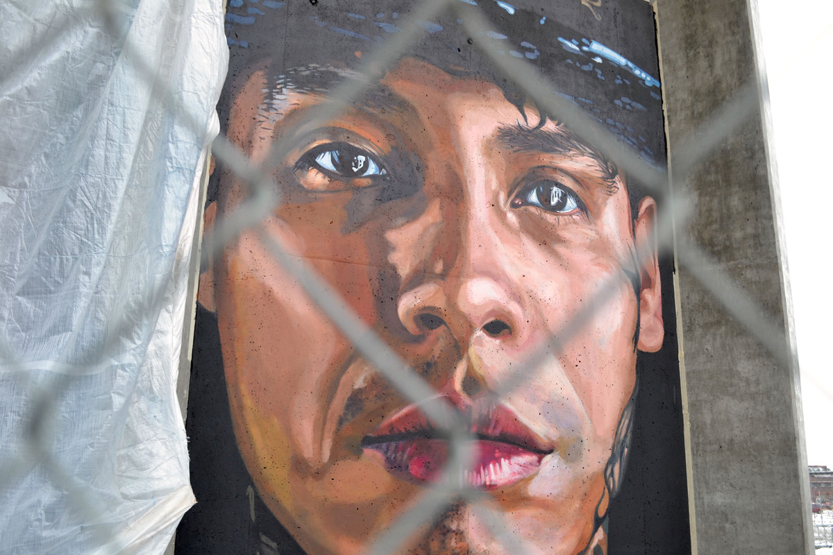 The mural, entitled “Pillars of the Community,” is designed to represent the downtown body. Those included in the mural come from different ethnicities and socioeconomic backgrounds to make the local community feel included. “It may not be their faces,” says Folkmann, “but if it’s a Cree person, they’ll see a Cree person, or if it’s a young artist, they’ll see another artist, or if it’s a kid, they’ll see another kid.”