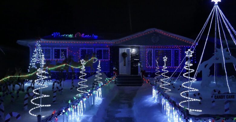 The event featured decorated houses, sleigh rides, food trucks, and a snow sculpture competition. Visitors were encouraged to bring donations for the Edmonton Food Bank. Pictured are several decorated homes along Candy Cane Lane.