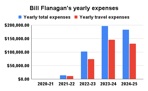 But from July 1, 2021 to March 31, 2025, Flanagan has spent $506,901.01 on travel and hospitality. Travel costs make up, on average, almost three quarters of the total expenses.