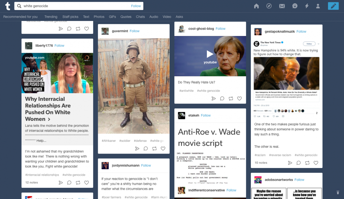 Search up “white genocide,” “pro-ana,” (as in pro-anorexia) or “anti-Muslim,” however, and you’re flooded with results.
