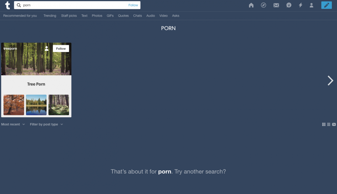 Speaking of predators, there’s a host of other issues that Tumblr seems happy to ignore. Search up “porn” on Tumblr, and you will now find nothing.